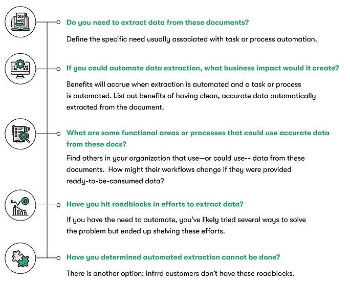 Don’t brush off answering this question. By thinking deeply about the effects of automation, you’ll come up with ways that automating the manual data extraction process can affect your business outcomes.