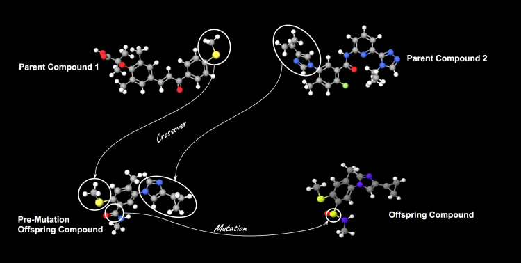 EAs utilize the main principles of Darwinian evolution, evolving better and better molecules as generations proceed. They do so by selecting parents based on their environmental fitness (demonstrated good behavior regarding the selected objectives) and breeding new individuals via crossover and mutation (see figure 2).
