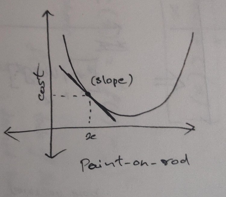 Once we know the error, we have to find the direction of where we should move our finger on the rod for a better solution. The direction is decided by taking the derivative of the cost function with respect to the decision variable(s). This simply means calculating slope(‘dC/dx’ ) on the curve for a specific value of the decision variable, this slope is known as the gradient. The greater the slope, the further we are from the minima(i.e., the lowest point on the curve).