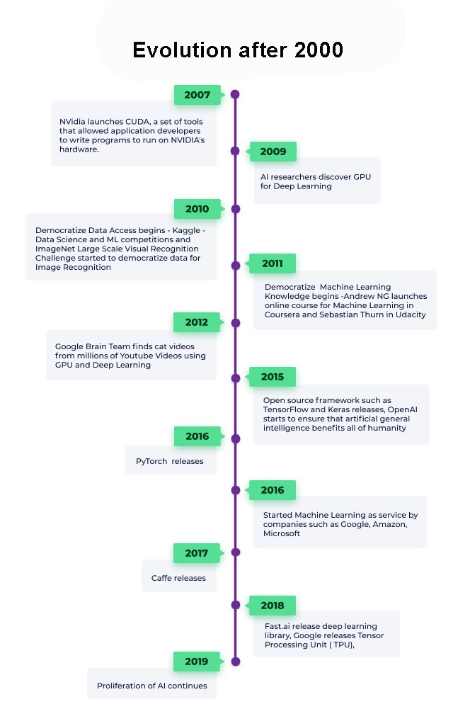 The need for a massive amount of data and enormous computing power disrupted the progress in the 80s. The 21st century, however, brought the concept quickly back to life proving Moore’s law. The heavy processing power that tiny silicons hold today has made AI feasible in the current context, also enabling to build improved algorithms.