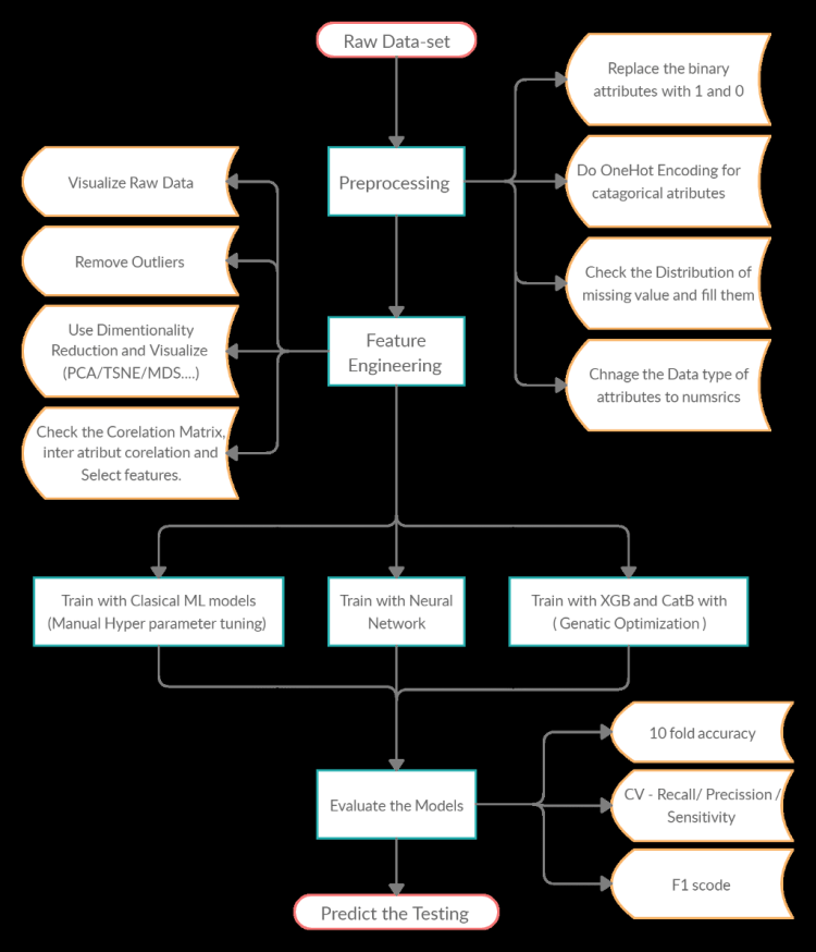 In conclusion, initially, the raw data has been taken and passed through the prepossessing which consist of encoding the categorical data and replacing the missing values. Thereafter, data has been visualized in many different ways using dimensionality reduction methods, removed outliers and checked the correlation matrix and checked the features with the domain understanding. Next, 11 different models were trained using Classical Machine Learning models, A neural network has been trained with the full data set and the PCAed data set and finally, two models (XGB classifier and CatB classifier) have trained using genetic Optimization for 100 generations. Finally based on the F1 score and accuracy the models were selected which are XGB with granitic optimization and the neural network trained with the full data set.