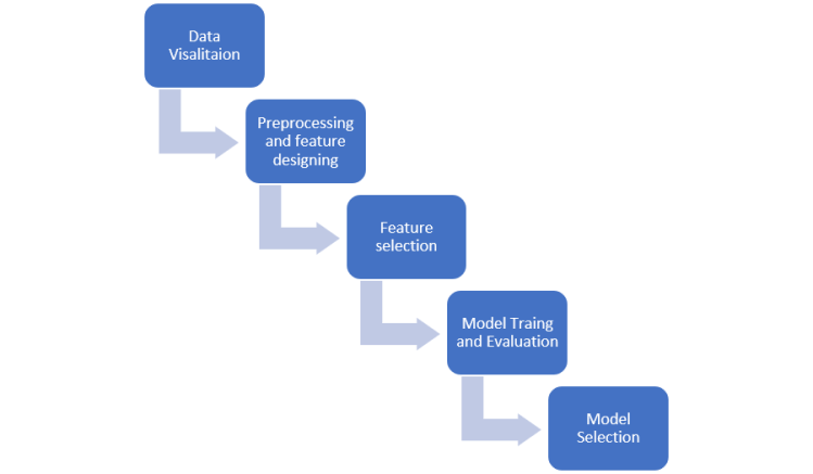 As mentioned in the flow chart the data has been visualized at first and pre-processed while creating new features. Thereafter the attributes will be selected based on the statistical and domain understanding, next different classification models will be trained and finally select the best model based on those prioritise the features.
