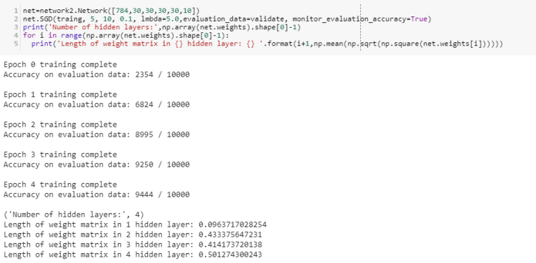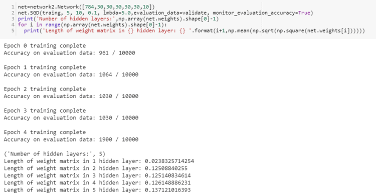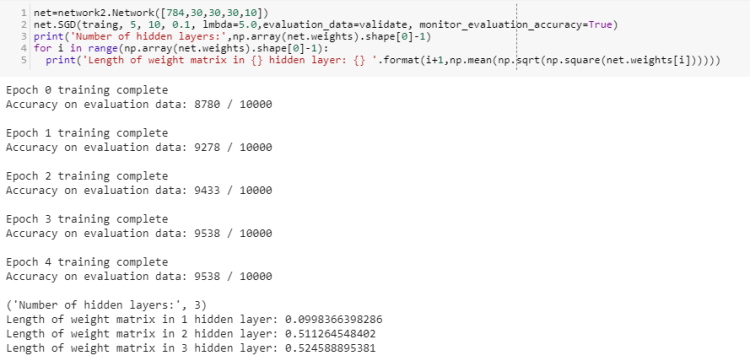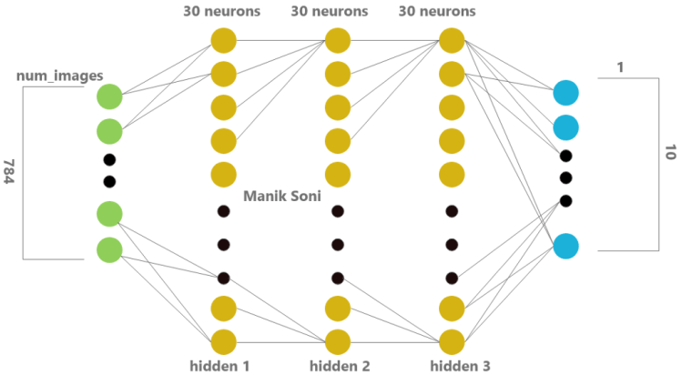 line 1: 784 denotes the input neurons,30 denotes neurons in hidden layer 1, 10 denotes number of outputs.