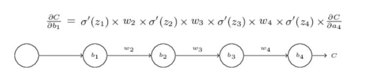 Consider a neural network with 4 hidden layers with a single neuron in each matrix.