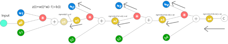 In forward propagation, we just multiply the input with weight matrices and add bias as shown above. We then find the sigmoid of the output.