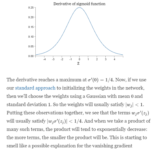 The sigmoid’(z1),sigmoid’(z2).. etc are less than 1/4. Because derivative of sigmoid function is less than 1/4. See below. The weight matrices w1,w2,w3,w4 are initialized using gaussian method to have a mean of 0 and standard deviation of 1. Hence ||w(i)|| is less than 1. Therefore, in derivative we multiply such terms which are less than 1 and 1/4. Hence on multiplying such small terms for a huge number of times we get very small gradient which makes the model to almost stop learning.