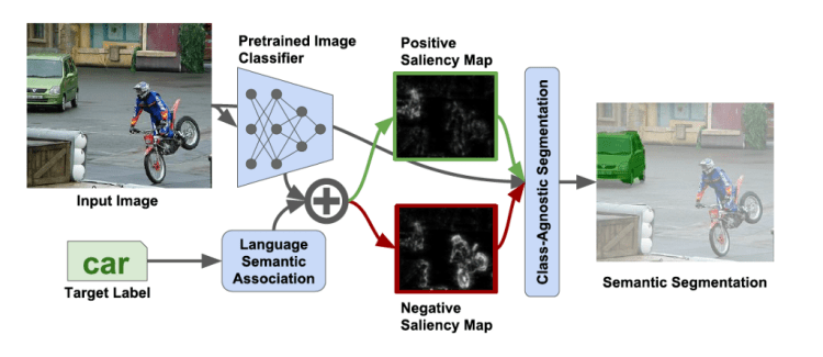 The input image is passed through a pretrained image classifier (in their case they used Imagenet-1k VGG-19) whilst the label is passed through a language semantic association model (in their case they explored WordNet and Word2vec, eventually landing on WordNet). The outputs of the classifier and language model are combined to produce positive and negative saliency maps for the image, and these two maps are fed into a semantic segmentation model with attention. This model outputs the probability that each pixel belongs to each class label. In experiments, this approach achieved 3.2% higher accuracy than the previous state of the art 5-shot approach.