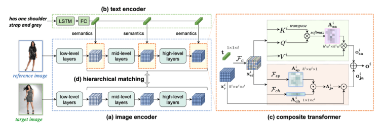 To me, the most fascinating part of this research is in the visiolinguistic representation using the composite transformers. The visual and language features are fused and then passed through a two-stream module that learns attentional transformation and preservation. First, the self-attention stream learns non-local correlations in the fused features and generates an attention mask that highlights spatial long-range interdependencies. In parallel, a joint-attention stream works to retain the visual features of the reference image. The outputs of these two streams are combined to create a set of composite features.