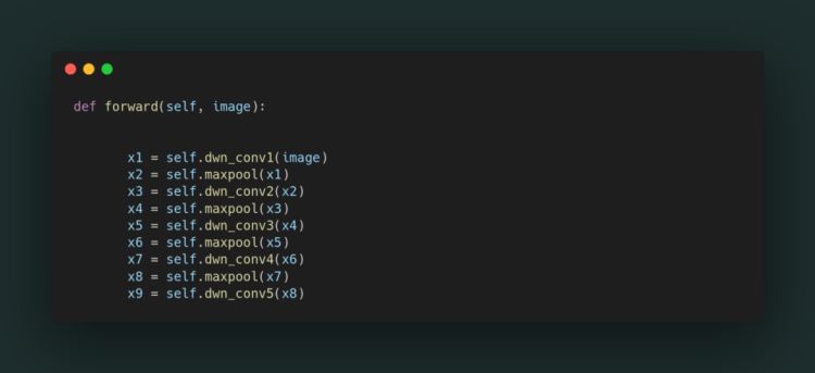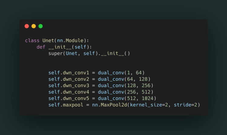 We will create a class Unet() and make the layers of the left side and a maxpool layer(the red arrow in image). In each layer, we use dual_conv() as it uses dual convolution. Let's just name the layer as dwn_conv (5 layers are on the left side).