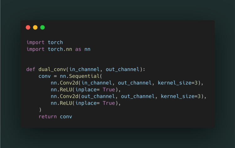 As we have seen in the architecture a 3×3 double convolution layer followed by the Relu activation function is used on both right and left side.