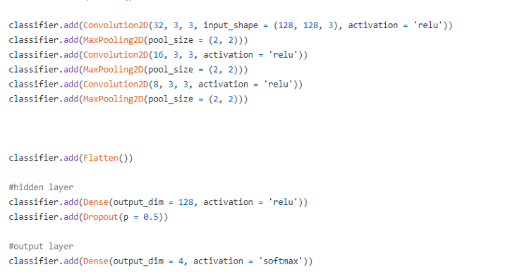 A raw code of layers in visible in Fig-9 of the various layers we added to our network. The output layer is using the Softmax activation function, so that when we compare the images from real time by using our model, we will get the probability of each case(early blight, late blight or healthy) for the captured image. The case which would have the highest probability would be assigned to the image and appropriate action would be taken. For example, suppose a particular leaf is captured by the bot. When run through the model, the algorithm gives us 0.6 probability that it is early blight, 0.1 that it is late blight and 0.3 that it is healthy, so the algorithm will consider the leaf as infected with early blight and spray the requisite amount of medicine in the affected area. In the other case, suppose if it gave a probability of 0.6 as healthy, then the bot would have considered it as a healthy plant and resumed its traversal.