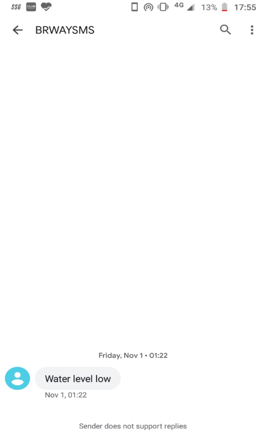 The second module, SIS (Smart Irrigation System) was also tested on a real farm with a controlled environment. I observed the system for about 24 hours and the outcome was very encouraging. The idea was too simple to execute and there was very less scope for human intervention. An SMS notification was sent to a pre-set mobile number each time any of the sensor would detect a moisture level of its surrounding oil area to be less than 40% (or any value pre-set in the algorithm). Fig 16 shows an example SMS as such received when using a single sensor in the system, as soon as the moisture level is recorded lower than a pre-set value, the python script running in Raspberry Pi will command the Arduino Board to power up the pump and release water near the area around that sensor, till the moisture level is not replenished to a certain value.
