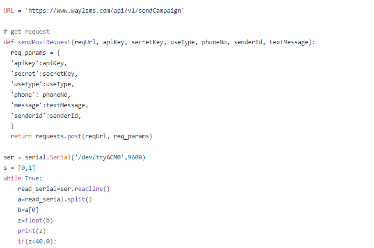 The many circuit board were connected to an Arduino Board where the code to control, read values of sensors and take appropriate actions was uploaded. The Arduino Board was connected to a CPU, Raspberry Pi (Model 3B+) where a python script was uploaded to launch at each reboot. The python script was coded using an api called ‘way2sms’ which enabled the script to send SMS to the farmer for each action or any important notification. (Fig 12).