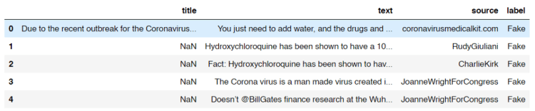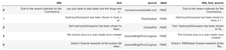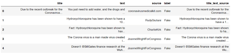 Next, the title, text and source columns are then going to be concatenated which the result is stored in another new column called title_text_source . This new column in our data frame df is going to be our raw X data.