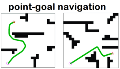 Then, using this input alone, the agent must take a series of simple control actions like “move forward for 0.25 m”, “turn left for 15 degrees”, to navigate to the goal.