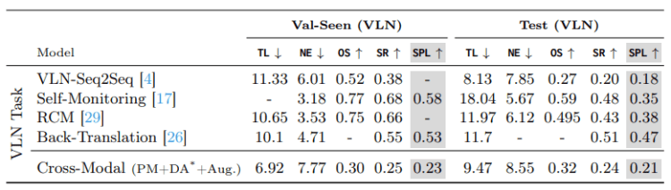 This is a comparison on the VLN validation/test datasets between this and the current state-of-the-art approaches.
