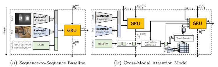 In short, the agent is given first-person vision, which they call Egocentric, and a human-generated instruction, such as this example; “Leave the bedroom and enter the kitchen. Walk forward and take a left at the couch. Stop in front of the window.”