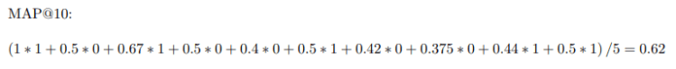 Consider, there are 5 relevant recommendations (m), we are making 10 recommendations (N) as follows — 1 0 1 0 0 1 0 0 1 1. Let’s calculate the mean average precision here.