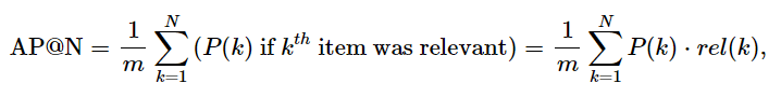 where P(k) is the precision value at the kth recommendation, rel(k) is just an indicator that says whether that kth recommendation was relevant (rel(k)=1) or not (rel(k)=0).