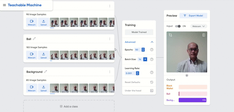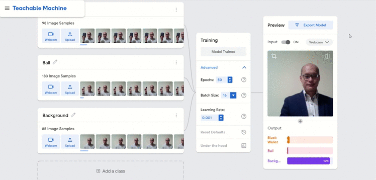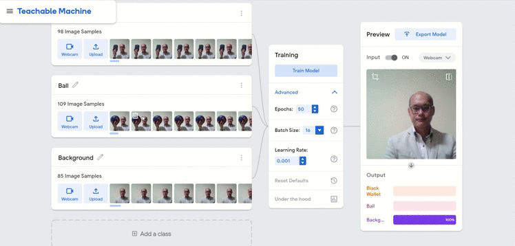 Notice that after we have completed training the model, we encounter our first issue. When I am not holding up any object, the model defaults to Class 1, which is that of the black wallet. Although it properly detects a ball when I hold up a soccer ball, this behavior might have unintended consequences further down the road.