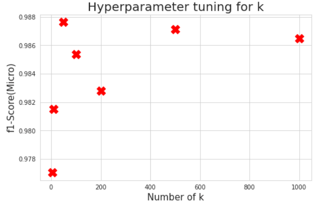 So to pick best number of k ,we did Gridsearch using different values([5, 10, 50, 100, 200, 500, 1000]) of K and then compare the results that we have calculated on test set