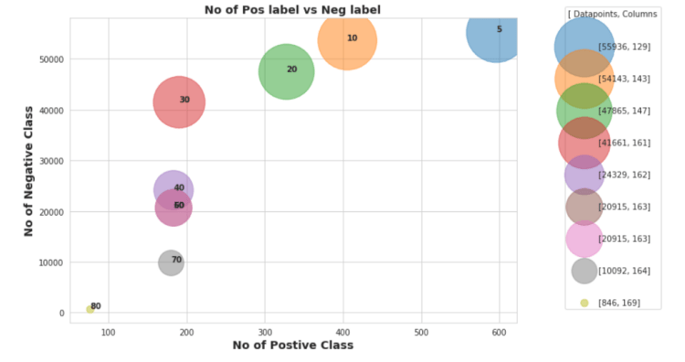 and we choose 5% as threshold then it clear that we won’t have to face datapoints loss , because with 5% we will have ~56,000 datapoints but , if you have noticed or not but we lost the almost 129 columns and classes are also highly imbalanced by selecting 5% we are loosing around 400 datapoints from class-1(positive) , which is also not preferred value to drop the columns