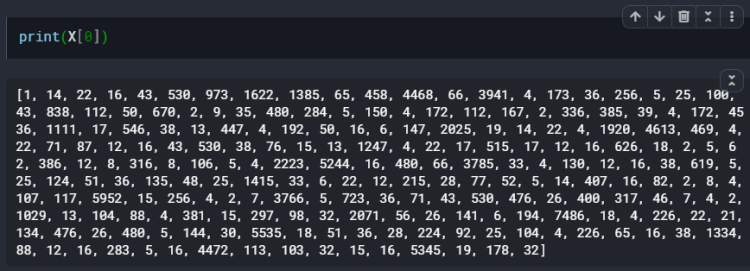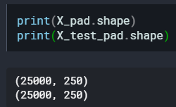 After running the code above, we can just check the shape of X_pad and X_test_pad. Number shown in the first axis in the figure below represents the number of samples while the next one denotes the word count.