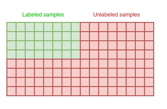 We know that basically all data in this IMDB review are perfectly labeled. However, since we are going to simulate semi-supervised learning algorithm, then we will assume that we only know a little part of those labeled data. The green block in the illustration below represents a portion of labeled samples whereas the red blocks are assumed to be the unlabeled data in the training set.