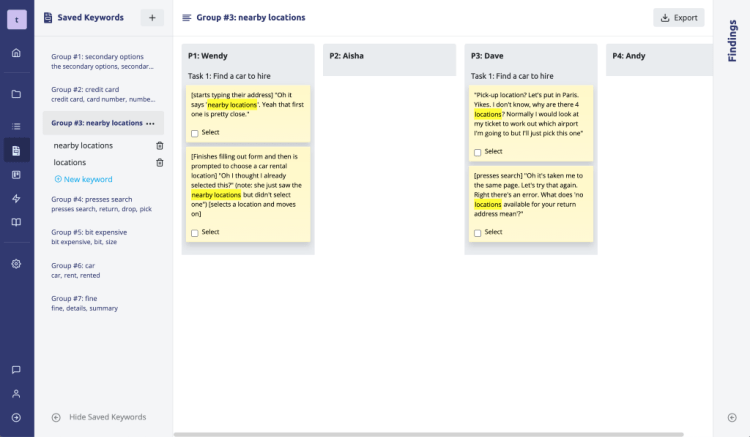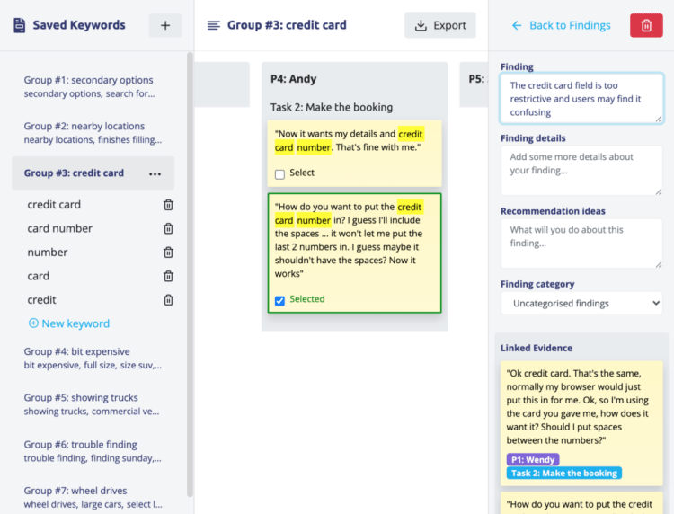 - The researcher can select groups of notes that contain that keyword and add them to a research finding