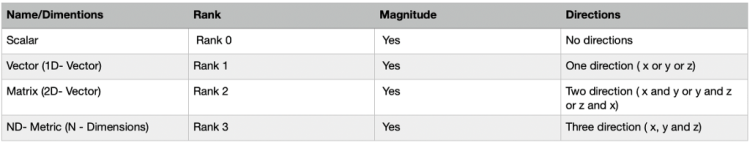 Every tensor has its rank which is defined by its magnitude and directions (below table describe the rank and magnitude of tensor):