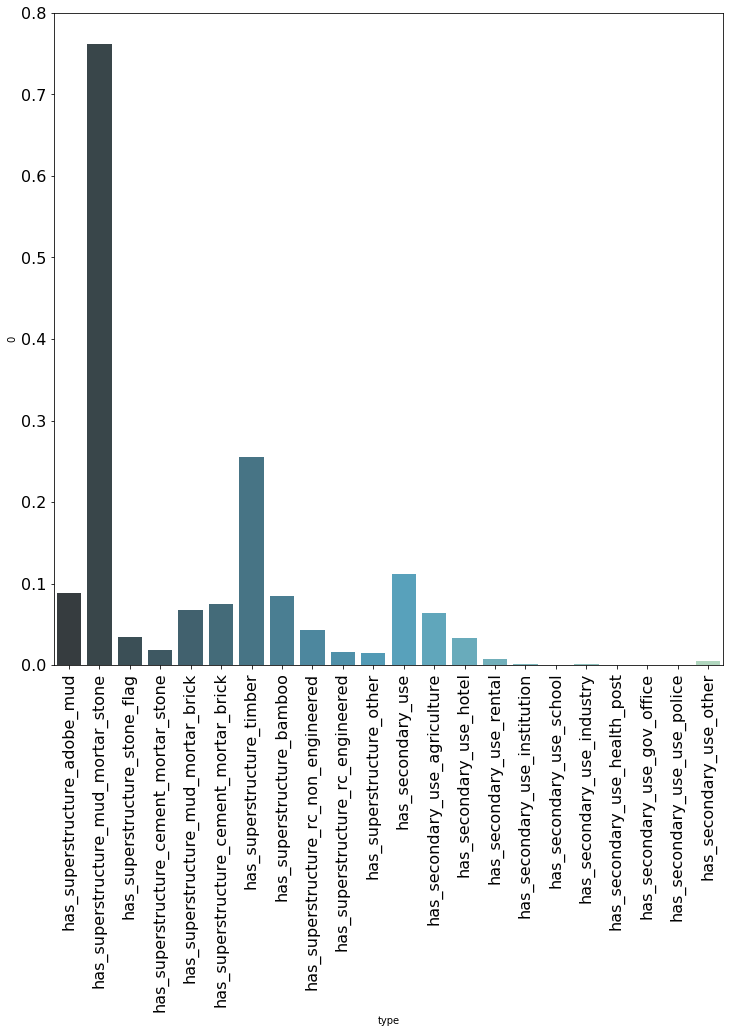 As we can see from the graph above, the most important variables to predict the damage grade of a house is the average damage grade of the different geo-locations. This makes sense, since the level of destruction of one house is likely to be correlated with the average damage of the houses around.