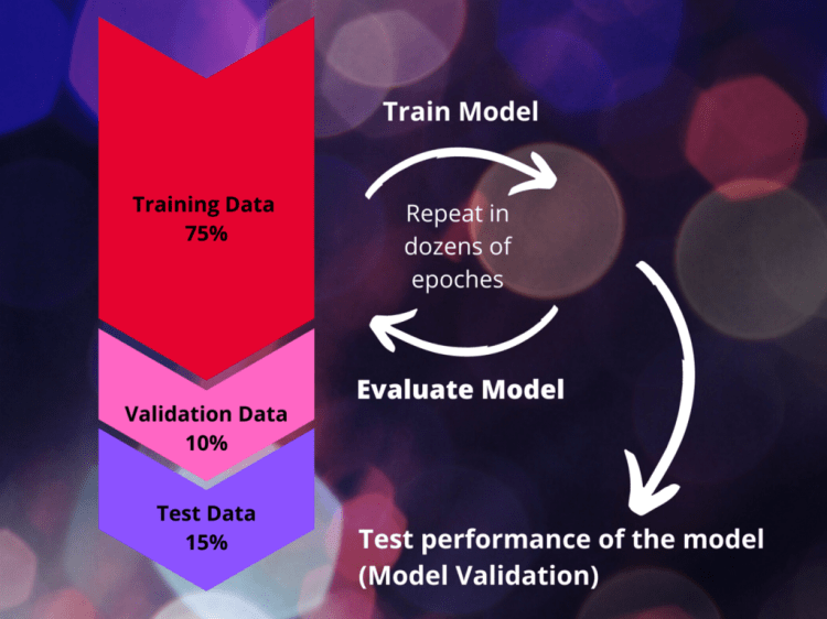 Before we start training the model we split the training data set into actual training data (the majority of the data, let’s say 75%), validation data (10%), and test data (15%). The actual distribution can vary depending on the amount of data available. Training data and validation data is used for model training. The test data is used after the training to validate the model performance with unseen data.