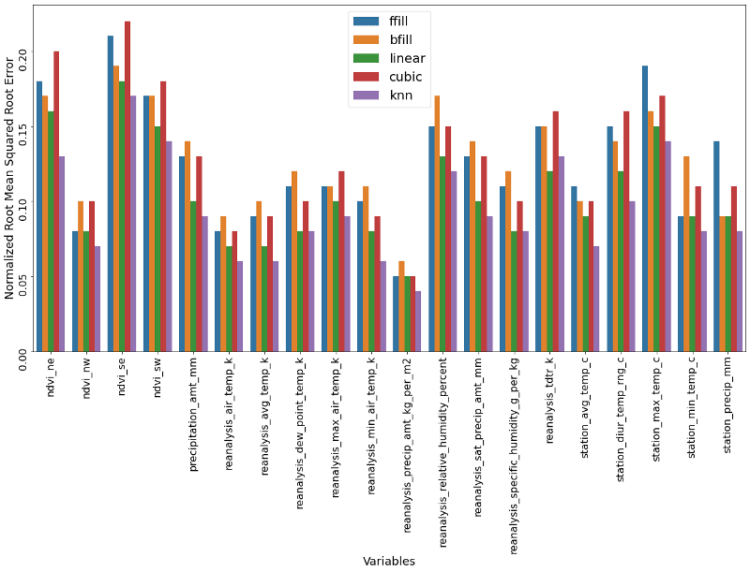 Now it is time to apply and compare of these methods. We do that by randomly dropping 50 observations of all columns, which are afterwards imputed by all before mentioned methods. Afterwards we assess each method’s performance through their NRMSE score. All of that, and the graphing of the results is done through the following code snippet.