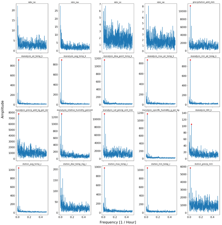 The plot below shows the resulting 20 exogenous variables. Whether or not a predominant and significant threshold is met for a variable is indicated by a red dot on top of a spike. If a red dot is visible, that means that the time series has a significantly driving frequency and therefore a strong seasonality component.