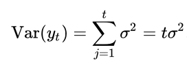When now calculating the variance of y_t, we face a variance which is positively and linearly dependent on time, which violates the second covariance stationarity rule.