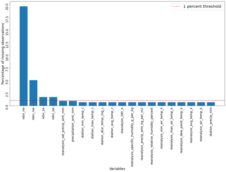 The resulting graph below shows four features which have more than 1 percent of observations missing. Especially the feature ndvi_ne, which describes satellite vegetation in the north-west of the city has a severe amount of missing data, with more around 20% of all observation missing.