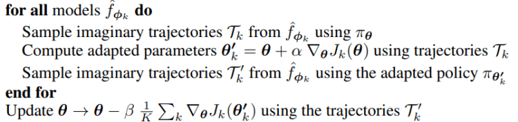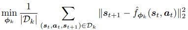 Trajectories are sampled from the real environment with the adapted tasks’ policies θ1,…, θK, and added to a data set D. These trajectories are used to train all models. The objective of learning each model is to minimize the L2 one-step prediction loss: