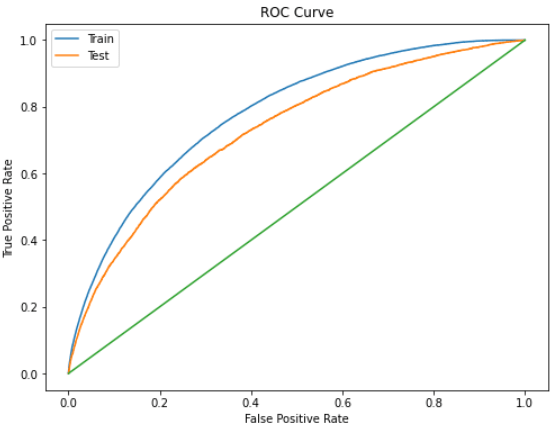 Now, we can see in the figure 25 above that the train ROC curve lies above the test curve, hence it’s straightforward why the blue curve produces higher AUC. Keep in mind that the green straight line is essentially used as the lower bound, meaning that if your train and test ROC is coincident with this straight line then we can simply conclude that the model is performing random guess instead of actually classifying the data samples.