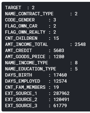 Pardon the weird indentation 🙂 We can see here that CODE_GENDER, NAME_INCOME_TYPE and NAME_EDUCATION_TYPE are having more than 2 unique categorical values. Hence, we need to convert these into one-hot format. My approach here is to employ get_dummies() function taken from Pandas library.