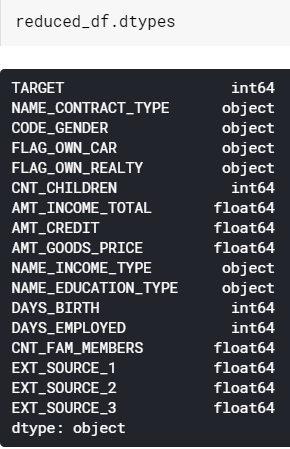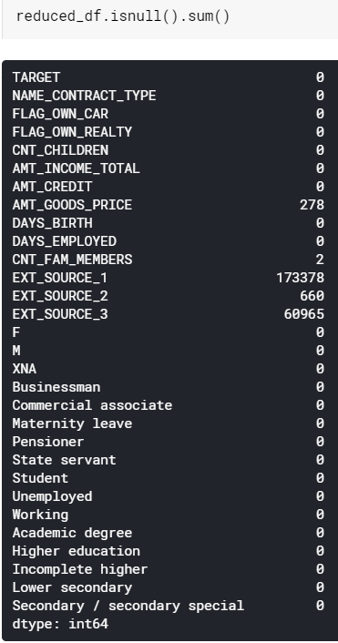 Initially, the shape of reduced_df is (307511, 17), where 17 indicates the number of existing columns. Subsequently, after running the code in figure 15 above, the data frame should now be having the size of (307511, 30). This number of column is taken from 17 (initial) + 3 (code gender) + 8 (income type) + 5 (education type) – 3 (no of columns converted to one-hot) = 30 (final result).