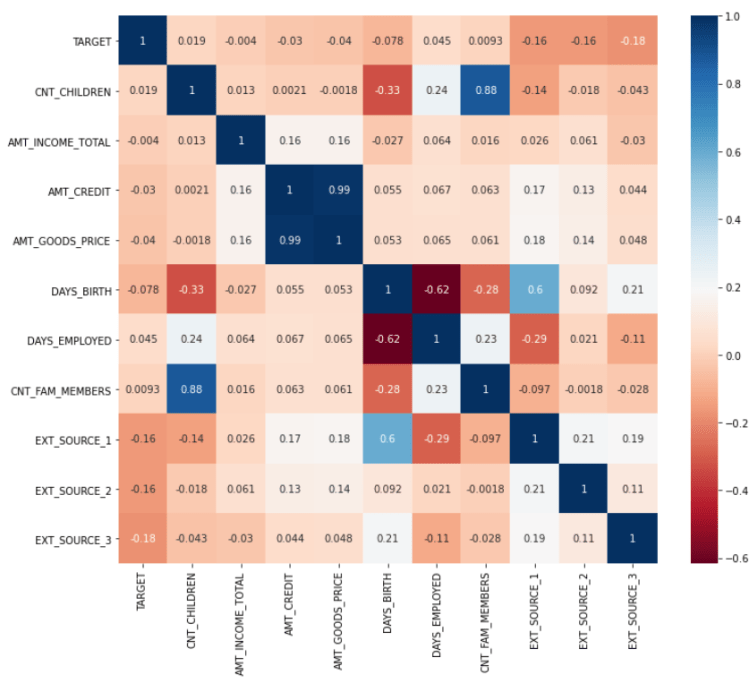 A little analysis towards this smaller data frame can also be done. The code shown in figure 11 displays how I construct a correlation matrix in which the output is shown in figure 12. The cell values of the matrix should essentially be in the range of -1 to 1 (inclusive), where the correlation of 1 means “when x is high, then the value of y is high as well”. On the other hand, negative correlation says “when x is high, then y is low”. The figure 12 below shows that positive correlations are highlighted in blue, while the colors are gradually changing to red as the score approaches -1. Also, when the correlation score is around 0, it means that the two variables are not correlated to each other. For example, CNT_CHILDREN has positive correlation with CNT_FAM_MEMBERS with the score of 0.88. This basically says that someone who have more children tends to have more family members. And well, this is absolutely making sense.