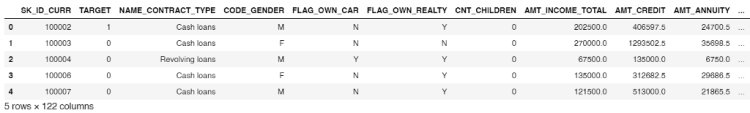 The result above basically tells us that the we got around 300,000 number of samples where each of those are having 122 attributes. By running df.head(), we will see how the first 5 data samples look like.