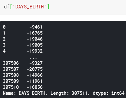 Next up, let’s look at the values of DAYS_BIRTH column. Here’s the code to do so: