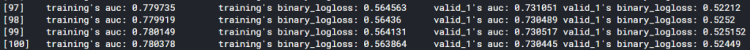 Afterwards, the model is fitted by applying fit() method to the LightGBM model (line 3). The parameters to pass are actually almost the same as Keras or Sklearn models. But notice that here I use AUC (Area Under Curve) as the evaluation metric, which is I think it’s not as commonly used as accuracy score. We’ll get deeper into this after the training is done.