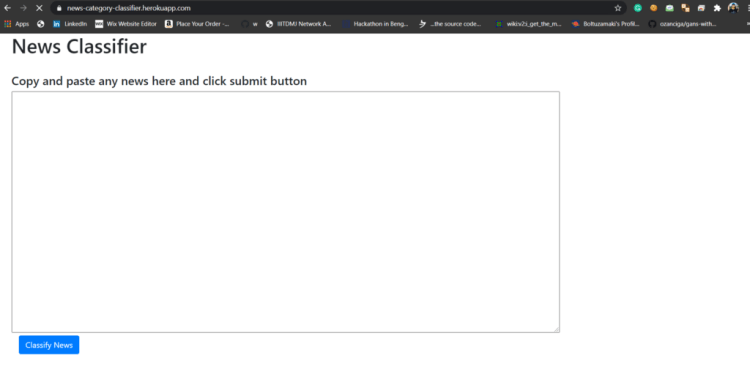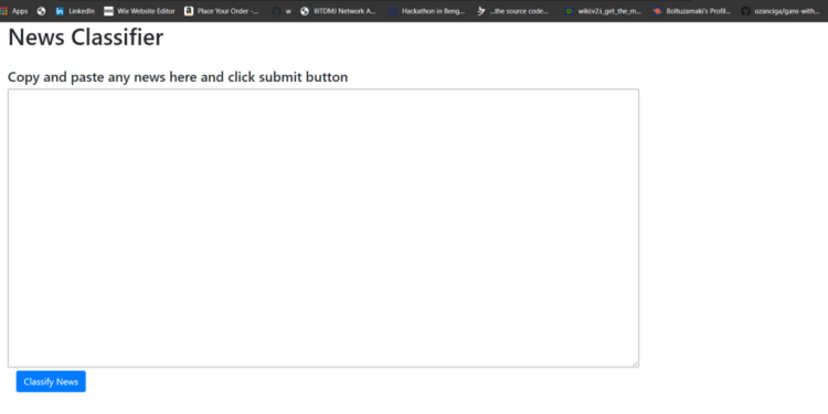 So we are going to make our homepage like this in which we have a huge text area where you can copy-paste your news and there is a button name classify news. Of course from using only HTML you can’t make pages beautiful. So what I have used here is Bootstrap. Those who not know about bootstrap in simple it is a framework which helps to make beautiful web pages by just copy and pasting code snippets that are provided on their official site and in very less effort.