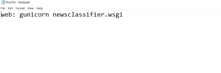 Go to your “newsclassifier” directory and create a file named Procfile and with no extension. And not open this file by clicking open with notepad.