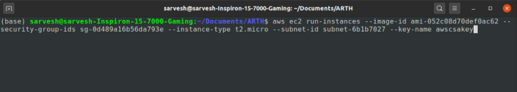 aws ec2 run-instances --image-id ami-052c08d70def0ac62 --security-group-ids sg-0d489a16b56da793e --instance-type t2.micro --subnet-id subnet-6b1b7027 --key-name awscsakey