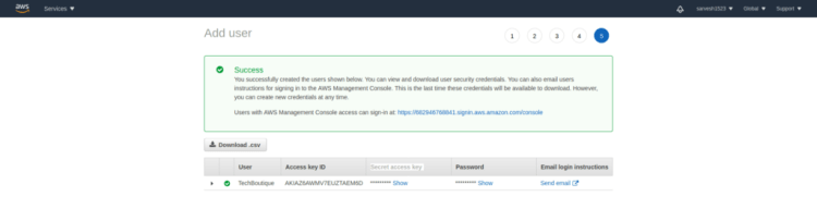 Note: Keep the CSV safe, don’t share the Access Key ID and Secret Access Key with anybody.