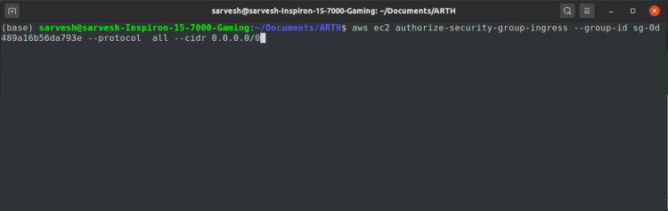 Once the security group is created, we need to add the rules for Inbound and Outbound, in our case we added the rules for inbound where we allowed all traffic from anywhere (entire world) using the AWS CLI.