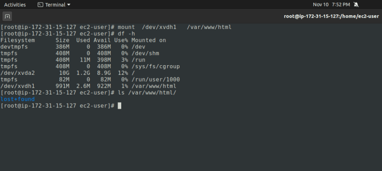 Once the httpd server is setup, we need to mount the formatted partitions created in the step 8 to the /var/www/html to make the location persistent.